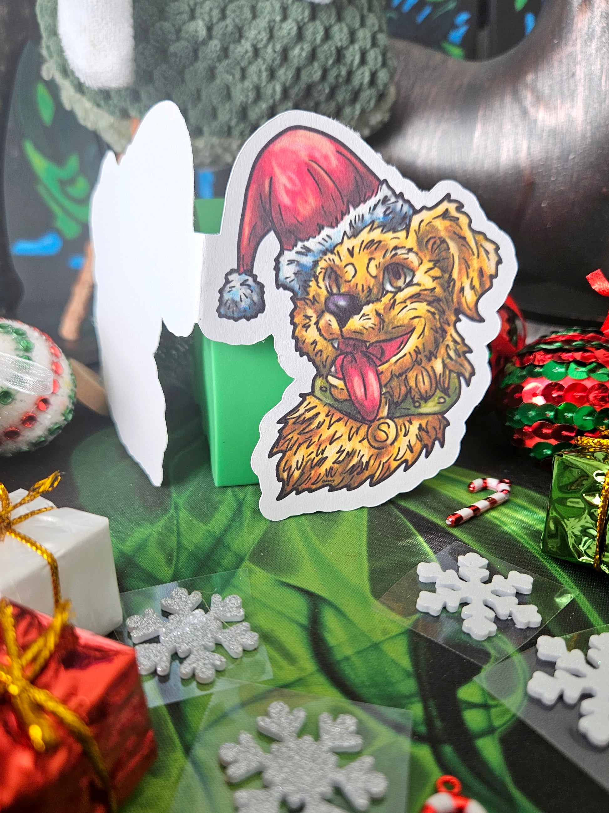 Here is a unique greeting card. It is a die-cut card featuring Settia the Dog. You are able to write it in it to send as a card, or include in a holiday gift. She adds a unique little twist to a holiday tradition.