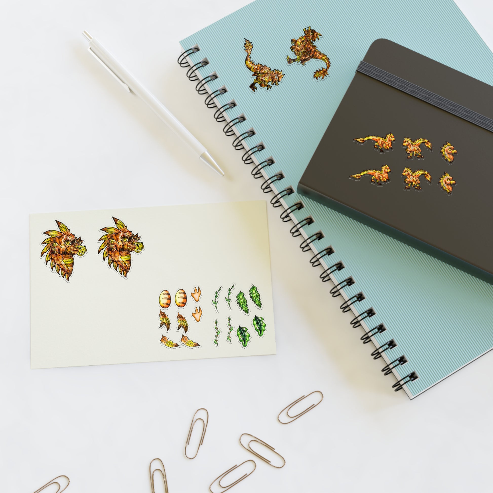 Here we have Caena the raptor sticker sheet. You receive 26 stickers of Caena in 2 styles along with extra little elements! She can help decorate and personalize journals or notebooks.