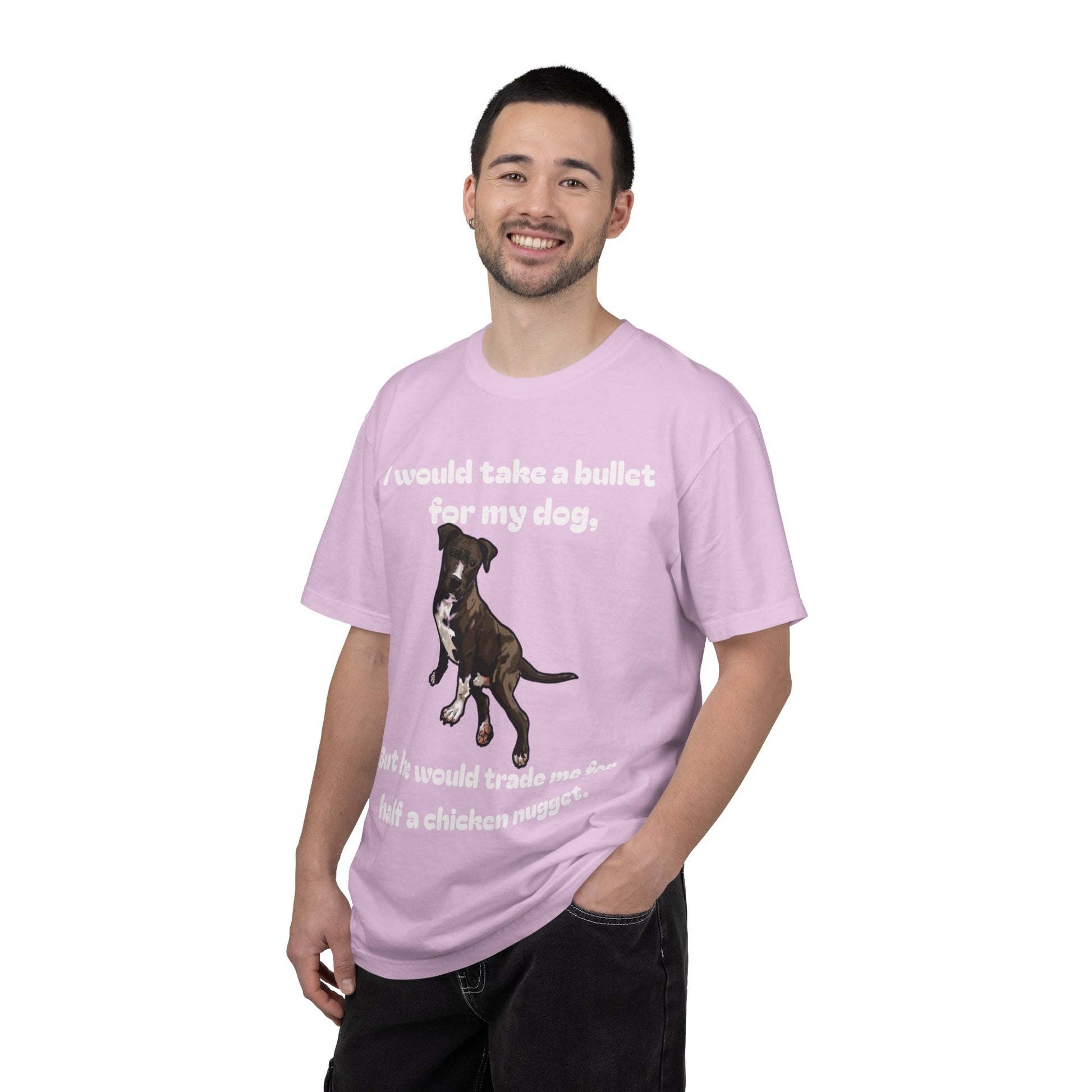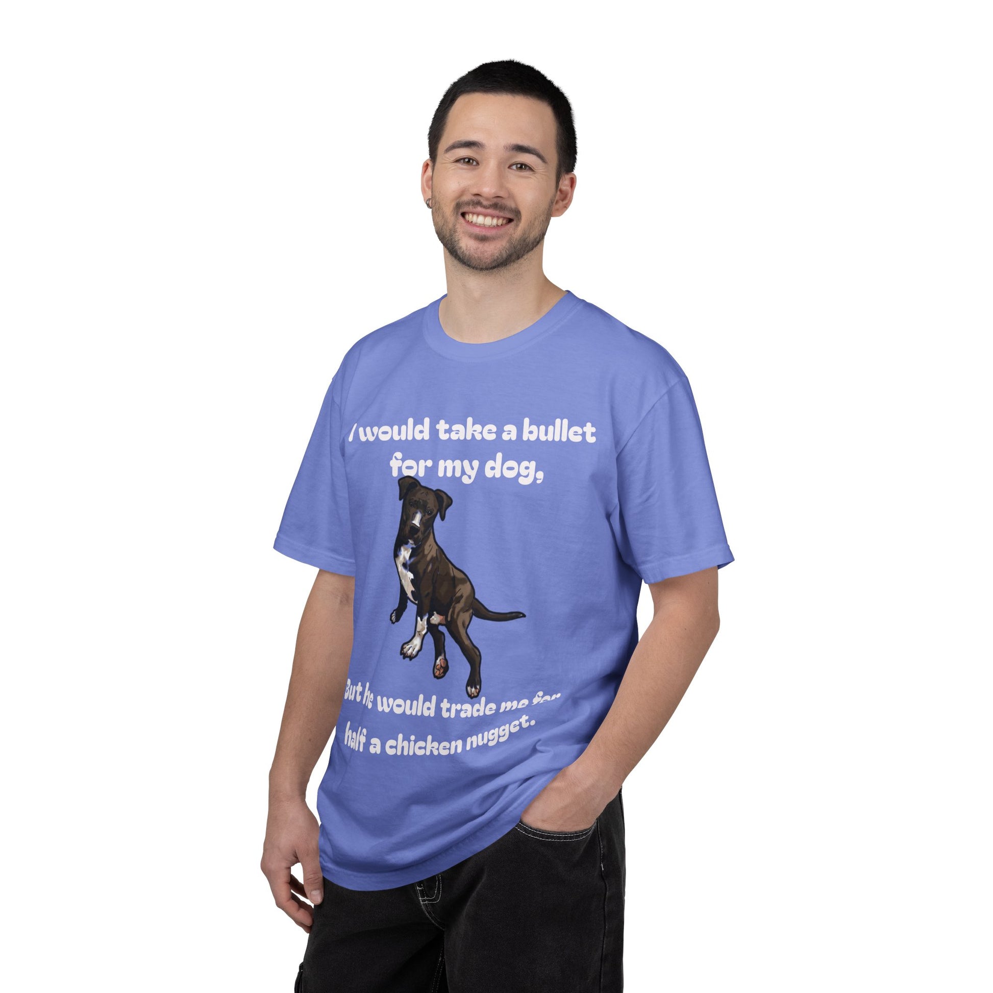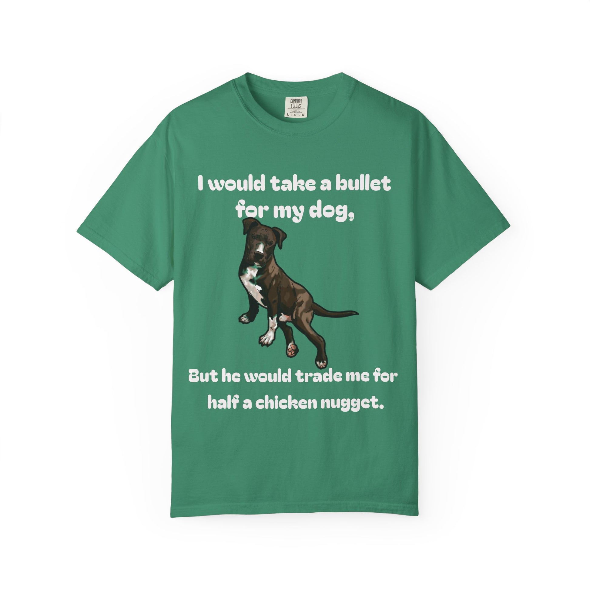 Here's a funny shirt featuring a dog to describe the loyalty test. The shirt says, "I would take a bullet for my dog, but he would trade me for half a chicken nugget."