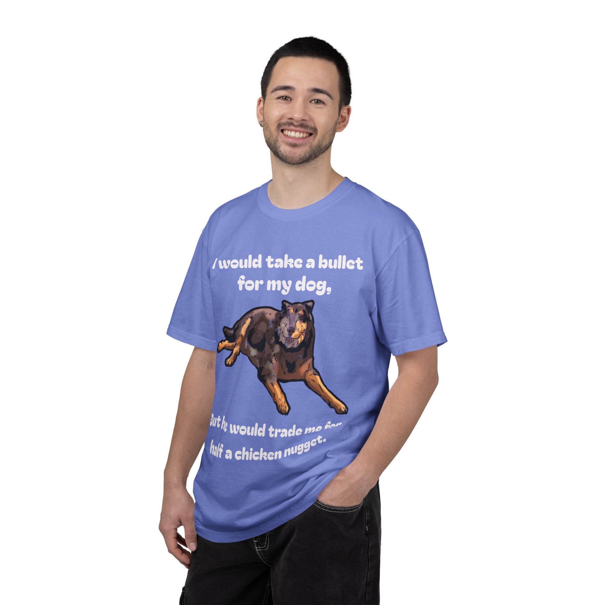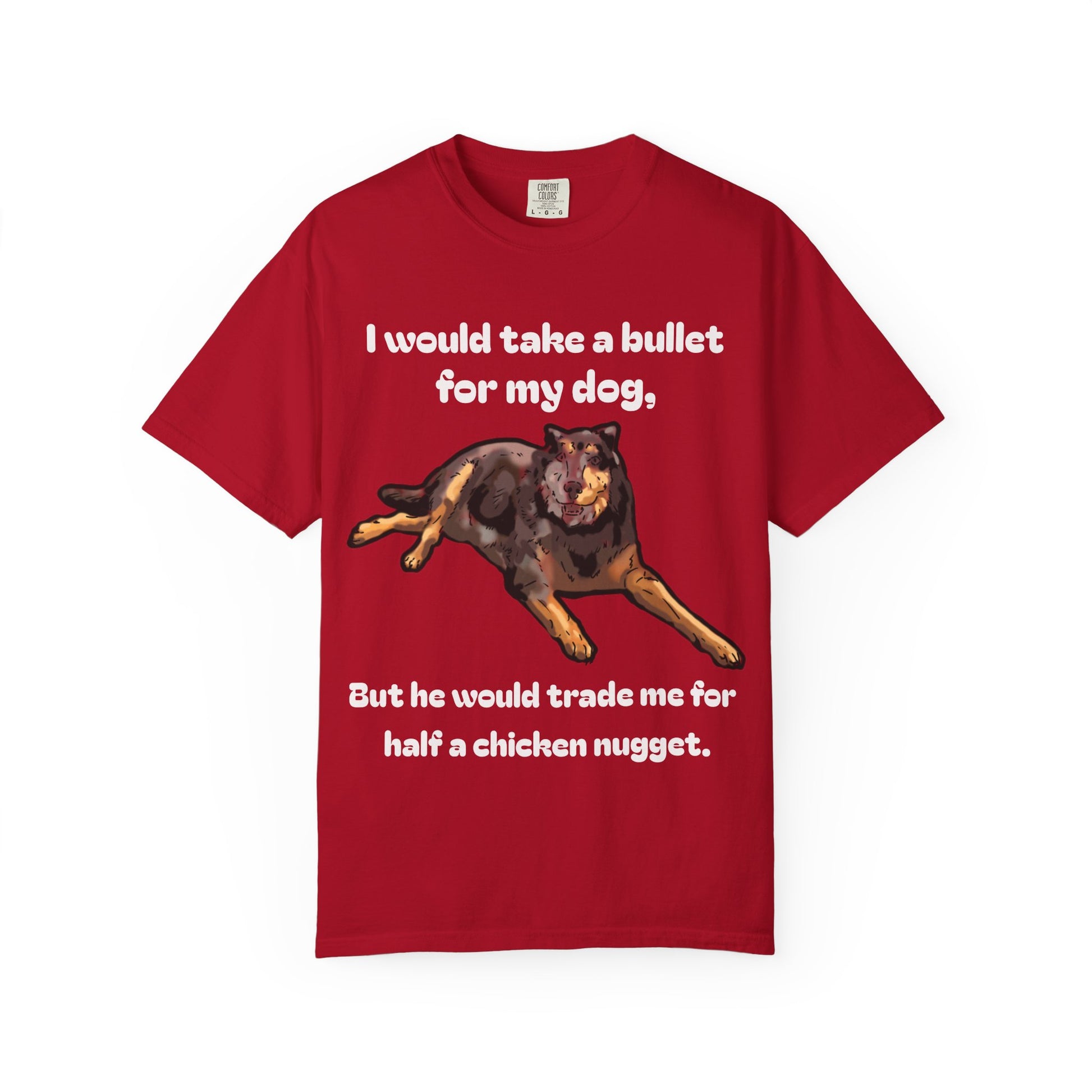 Here's a funny shirt featuring a dog to describe the loyalty test. The shirt says, "I would take a bullet for my dog, but he would trade me for half a chicken nugget."